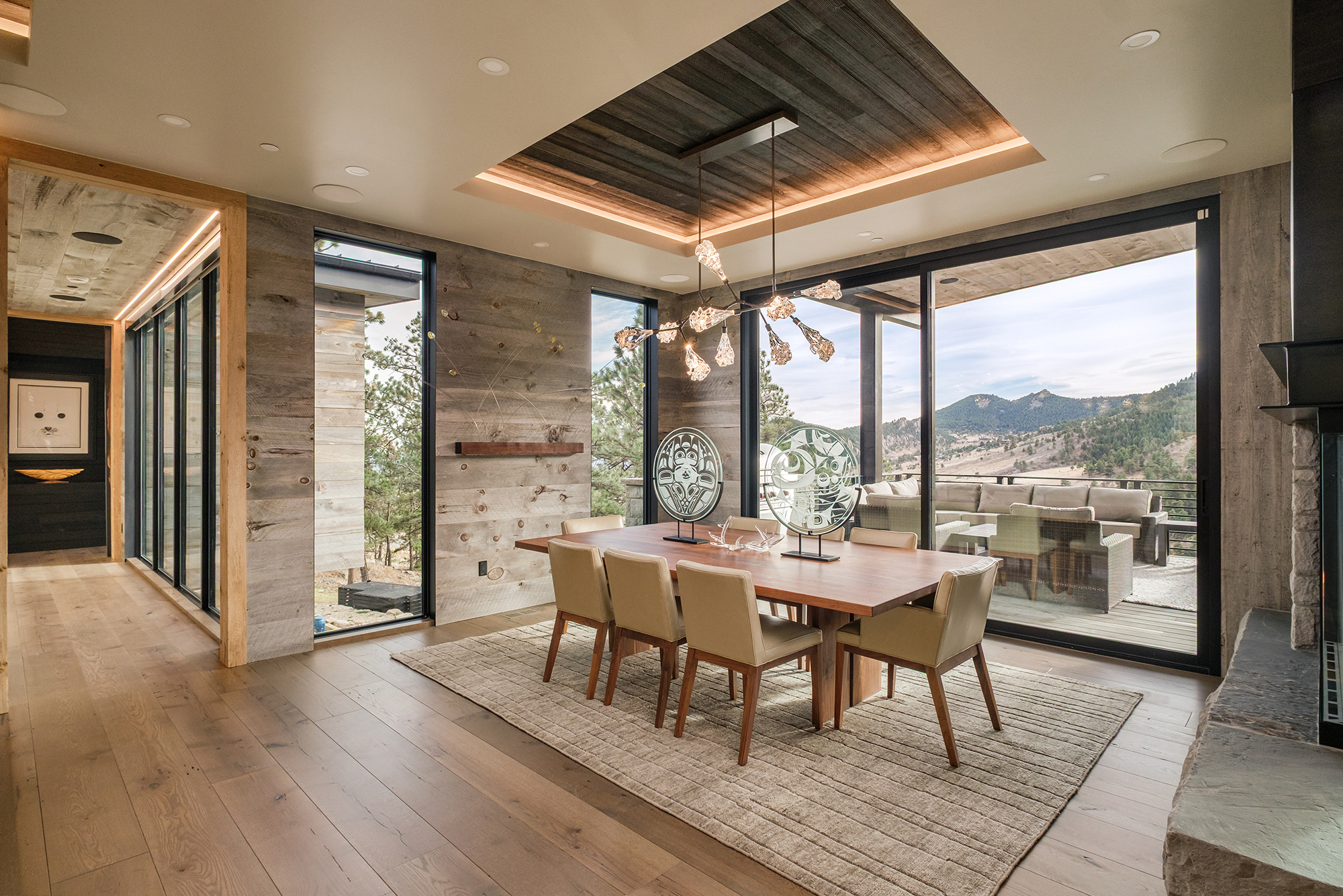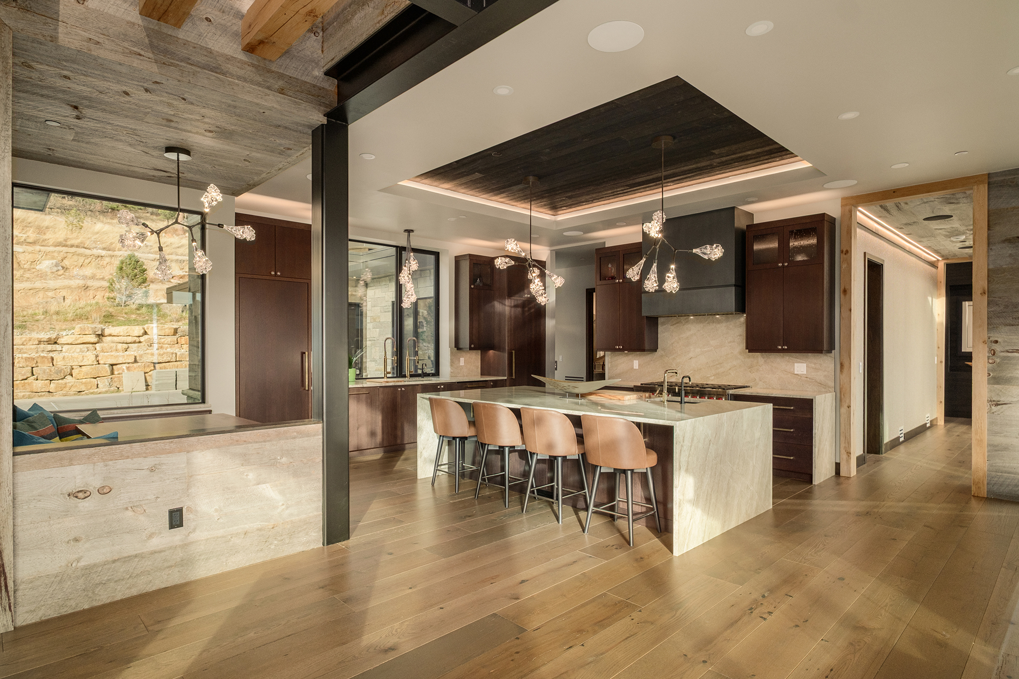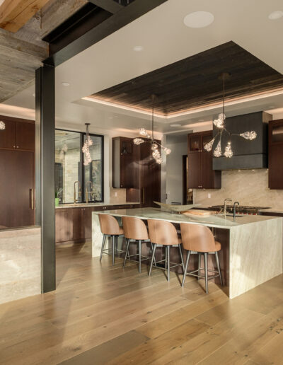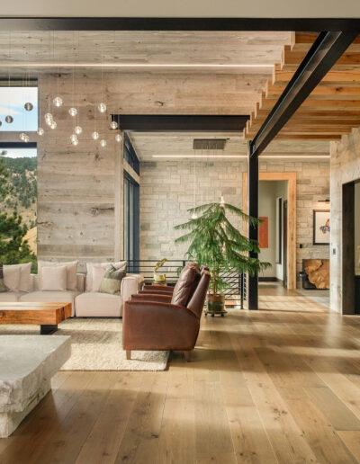 Set against the rolling foothills of Arvada, Coal Creek is a study in contrast—where rugged natural materials meet refined, modern architecture. Expansive glass walls frame sweeping mountain views, while structural steel, stone, and layered wood textures create a grounded, architectural rhythm throughout the home.